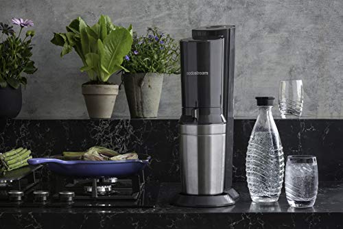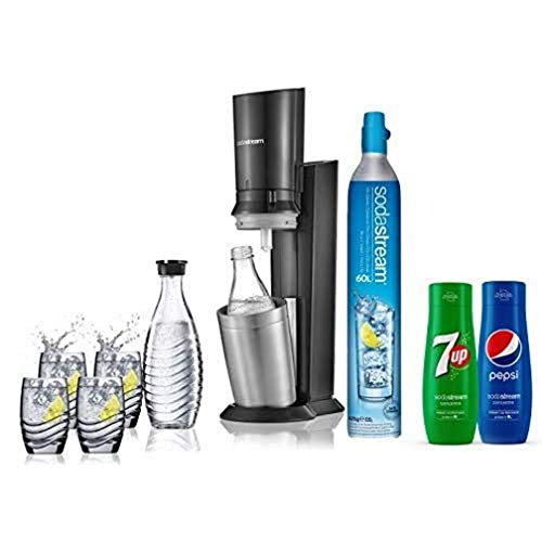 Nueva máquina Sodastream Crystal negro lista para usar con cilindro de C02 alimentario que permite realizar 60 litros de agua chispeante + 2 jarras de cristal de 0,6 litros, lavable en lavavajillas y reutilizable infinitamente + 4 vasos, 1 concentrado Pepsi y 1 concentrado 7up.