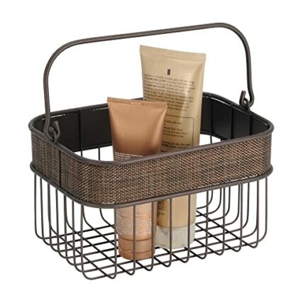 mDesign Cesta de almacenaje con asa – Moderno Organizador de baño para Productos de Belleza y Toallas de Manos – Práctica Cesta Decorativa con Adorno de plástico – Color Bronce